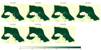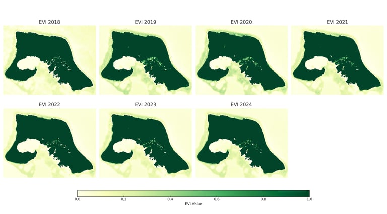 Enhanced Vegetation Index (EVI) provides refined insights into vegetation dynamics by correcting for canopy background and atmospheric influences. This index is especially useful in densely vegetated areas such as Tagalaya Island. The visualization reveals temporal fluctuations in vegetation health over a seven-year period: