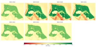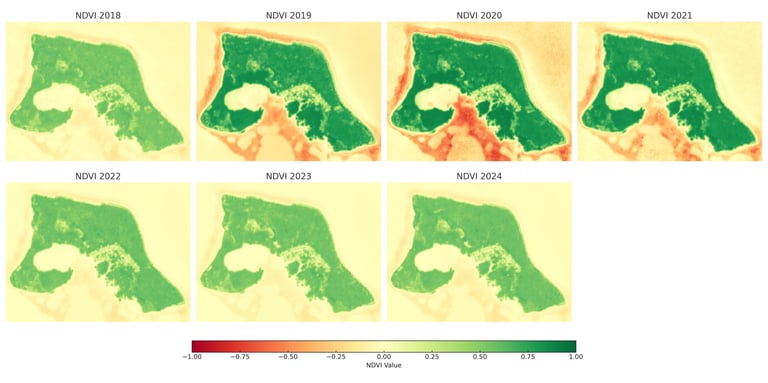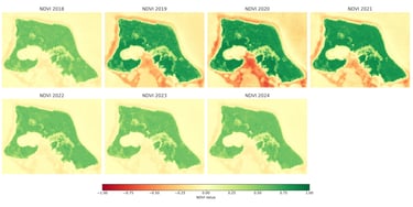 2023–2024: Gradual recovery of vegetative health, particularly evident in the northern and central zones, indicating ecological resilience or regrowth efforts.