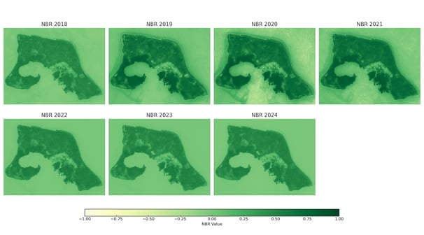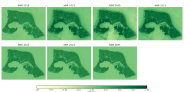 Normalized Burn Ratio (NBR) is a spectral index designed to detect burned areas, post-fire regrowth, and vegetation stress. It is especially effective in monitoring ecological disturbances and recovery in coastal and forested ecosystems such as Kakara Island. The visualization illustrates temporal variations in NBR values over seven years.