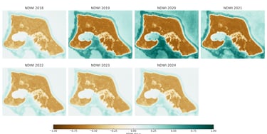 Normalized Difference Water Index (NDWI) highlights water bodies and soil moisture. This helps in identifying hydrological shifts, particularly in mangrove areas, wetlands, and coastal buffer zones.