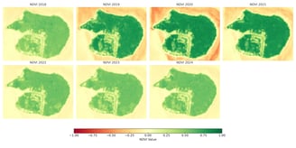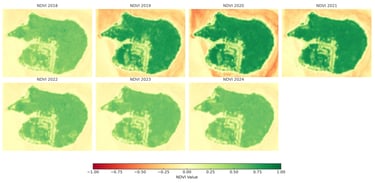 The Normalized Difference Vegetation Index (NDVI) serves as a vital indicator of vegetative health and ecological balance. This temporal analysis highlights the spatial dynamics of greenness across Kumo Island from 2018 to 2024. Higher NDVI values (closer to green) indicate denser and healthier vegetation cover, while lower values (closer to red) suggest sparse or degraded vegetation.