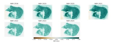 Normalized Burn Ratio (NBR) is a spectral index designed to detect burned areas, post-fire regrowth, and vegetation stress. It is especially effective in monitoring ecological disturbances and recovery in coastal and forested ecosystems such as Kumo Island. The visualization illustrates temporal variations in NBR values over seven years.