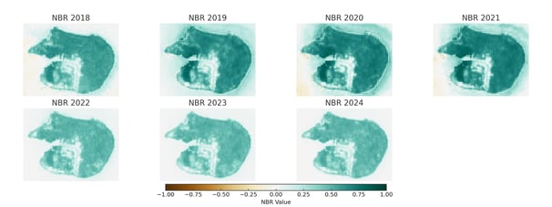 2018–2019: Stable NBR values across most regions, indicating minimal disturbance or fire-related stress.