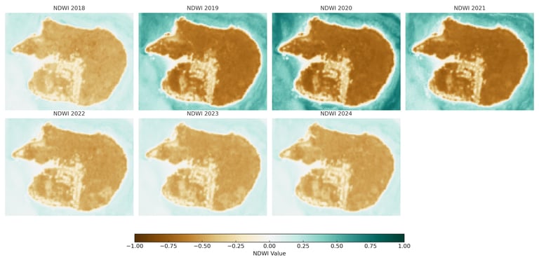 2020–2021: Drier surface patterns are evident, particularly along coastal edges, aligning spatially with NDVI reductions—suggesting possible vegetation stress or seasonal desiccation events.